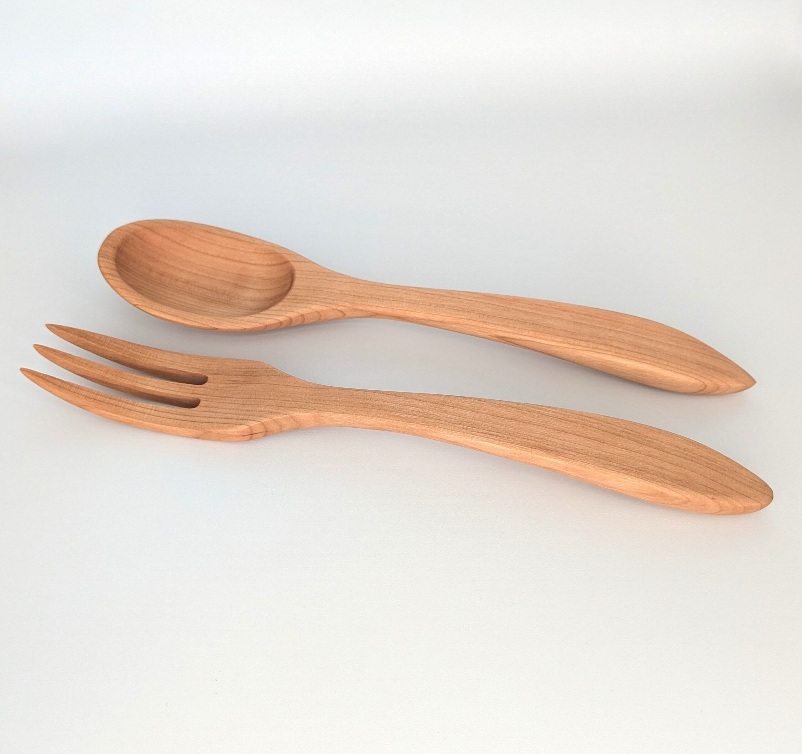 A beautiful handcrafted wooden spoon and fork set.